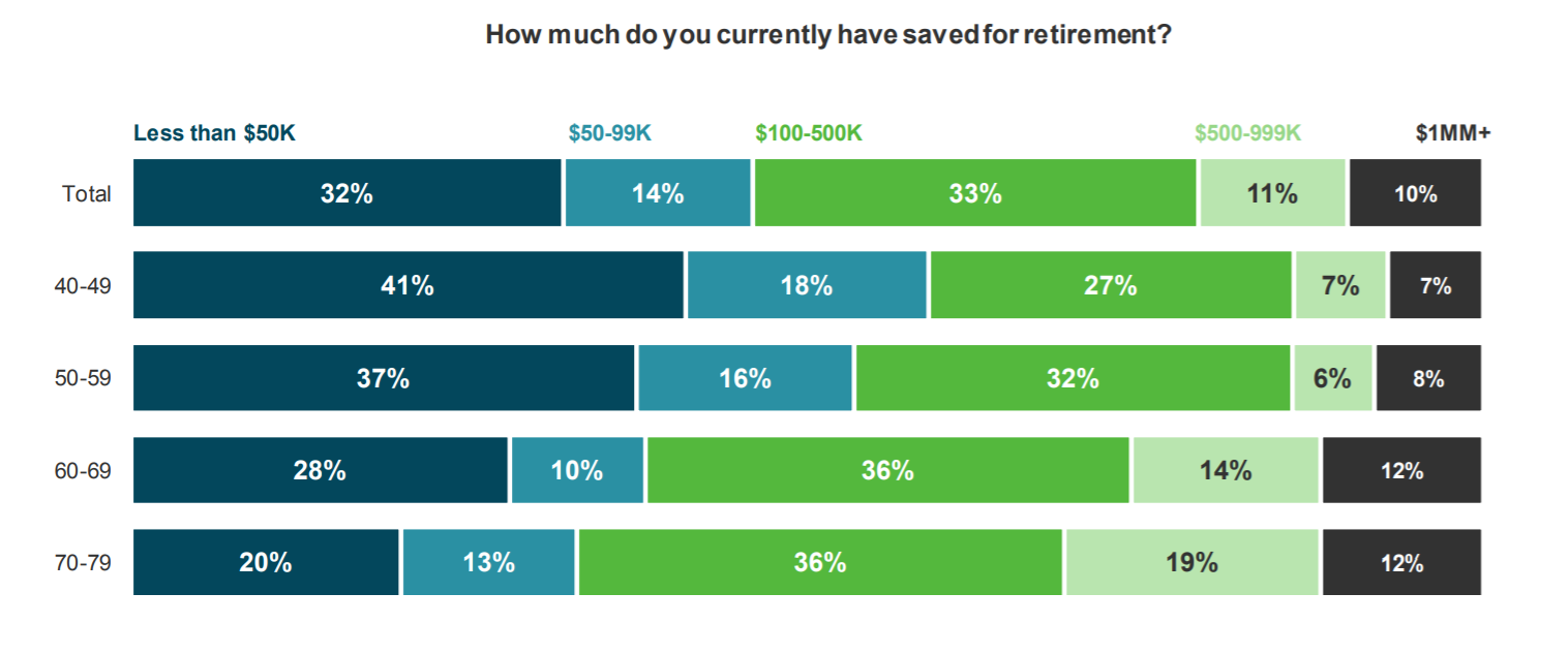 The BIG QUESTION: where are you today – do you live at, above, or below your means? If you’re like most people, you are not living below your means if the above data from The Harris Poll and TD Ameritrade is correct. It shows the retirement savings by age group. After four decades of working, only 15% have saved more than $500,000. That number jumps to 26% after five decades of working.
