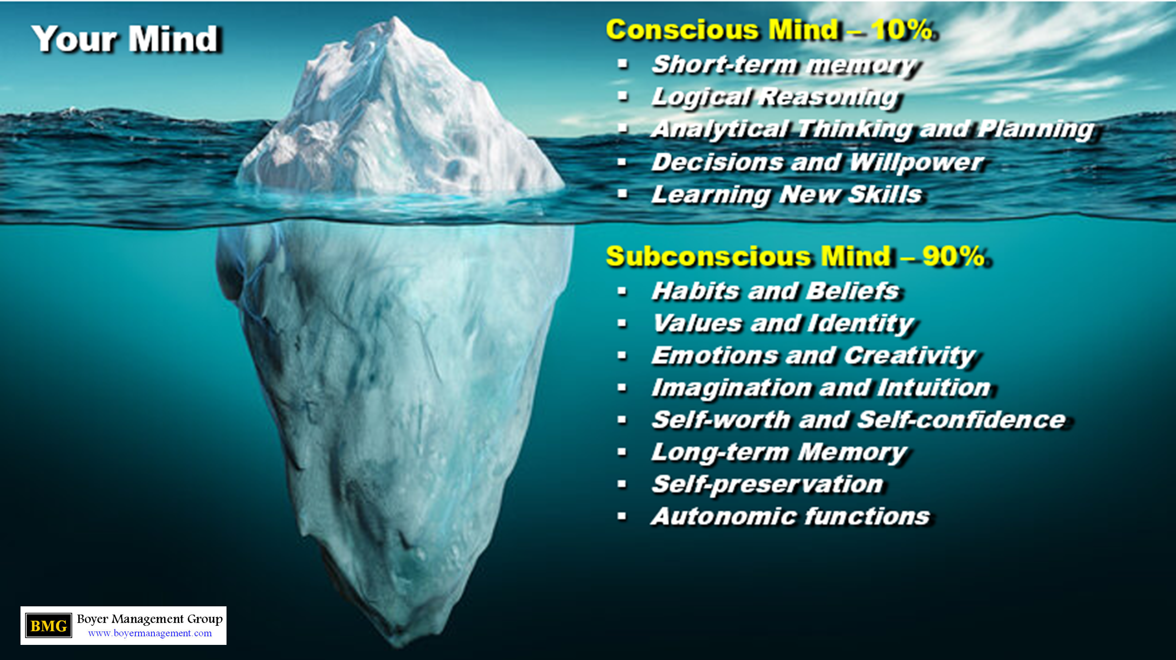- The conscious mind, which constitutes approximately 10% of brain function, is responsible for analytical thinking, rationalizing, decision-making, planning, willpower, and short-term memory. Your conscious mind cannot change itself; that requires your subconscious mind to program your conscious mind.