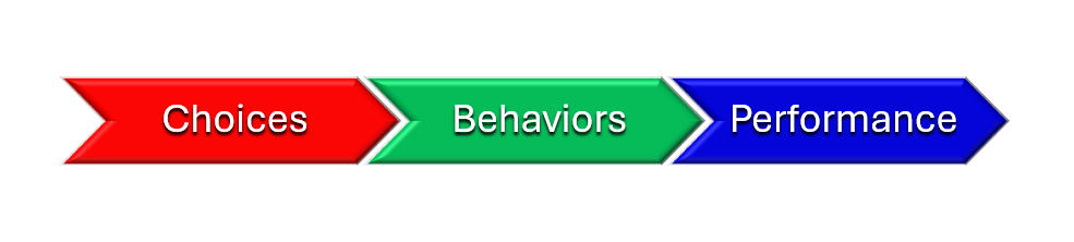 Thus, our choices drive our behaviors, and our behaviors drive our performance. If you want to change your performance or outcomes, you must change your behaviors.
